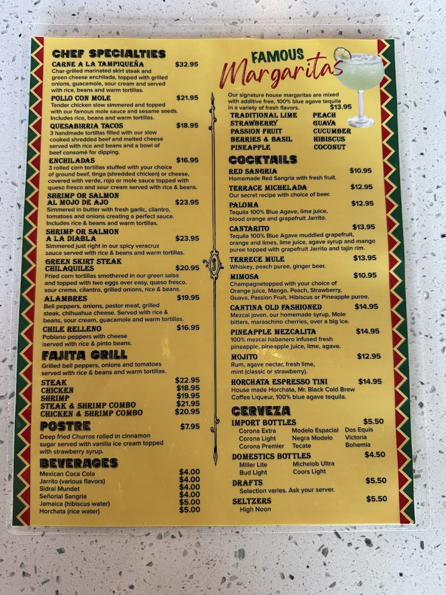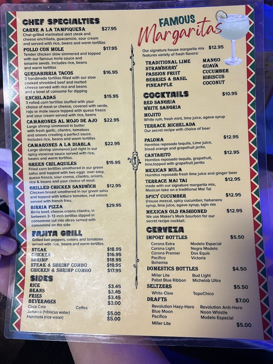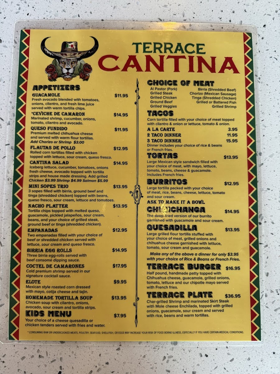 Whimsical desserts like churros are not to be missed, ensuring your meal ends on a sweet note. Terrace Cantina is more than just a meal; it's a must-visit destination for authentic flavors and unforgettable experiences.